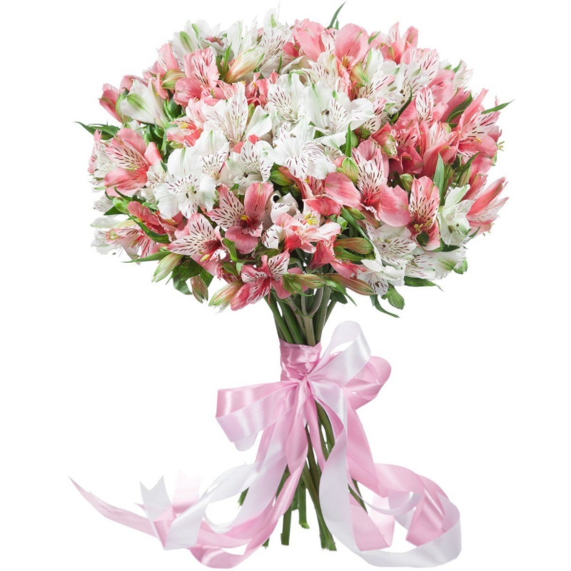 Букет состоит из 15 веток белой и розовой альстромерии, прозрачная упаковка, атласная лента.