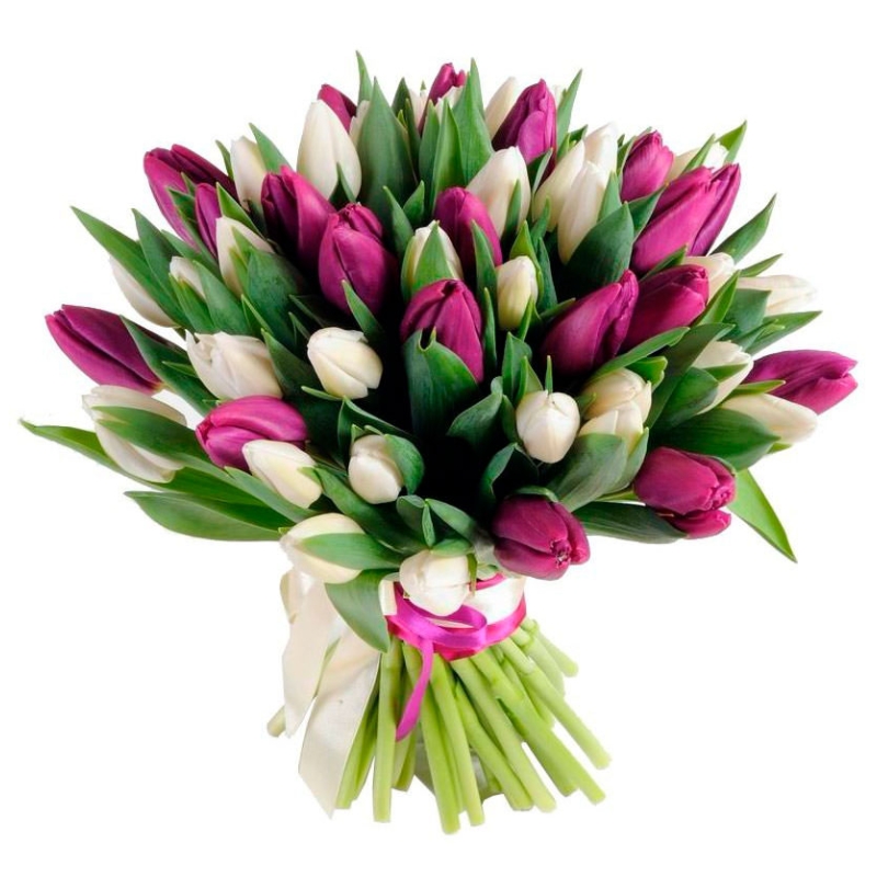 Букет состоит из 26 сиреневых тюльпанов, 25 белых тюльпанов, лента.