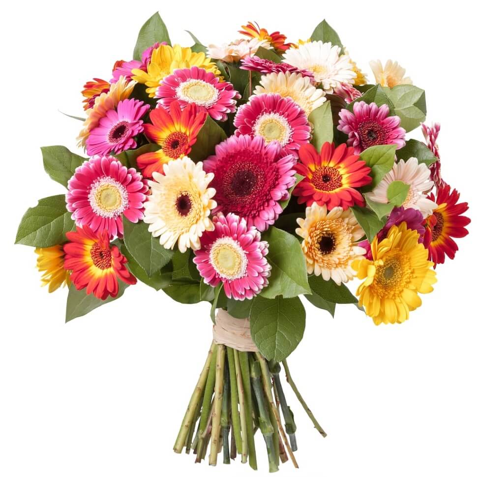 Букет состоит из MIX из 29 гербер, зелень, прозрачная упаковка, атласная лента.