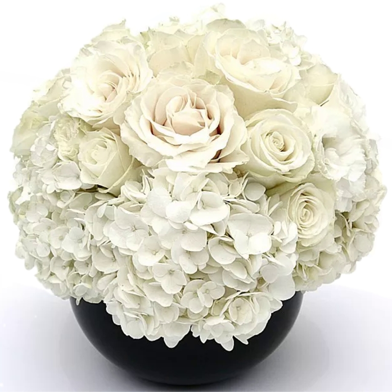 Букет состоит из 6 белых гортензий, 9 белых роз, коробка, оазис.