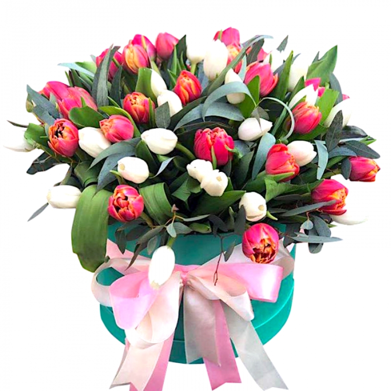 Букет состоит из 26 красных тюльпанов, 25 розовых тюльпанов, зелень, атласная лента, коробка, оазис.