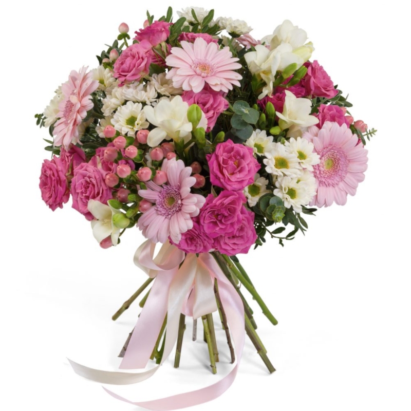 Букет состоит из 5 гербер, 4 кустовые розы, 6 фрезий, 4 ветки хризантемы, 7 гиперикум, зелень, прозрачная упаковка, атласная лента.