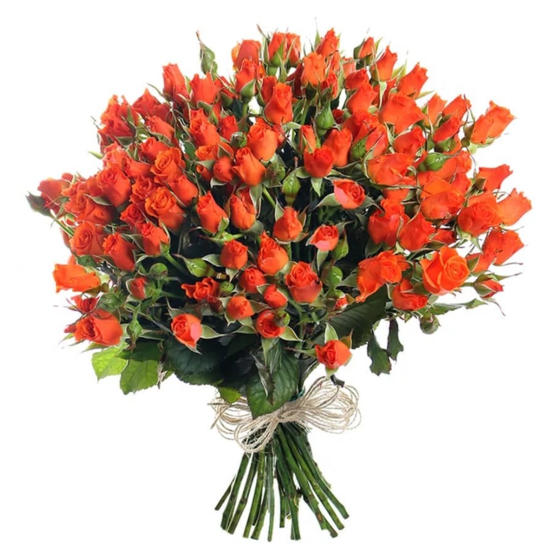 Букет состоит из 31 кустовая оранжевая роза, прозрачная упаковка, атласная лента.